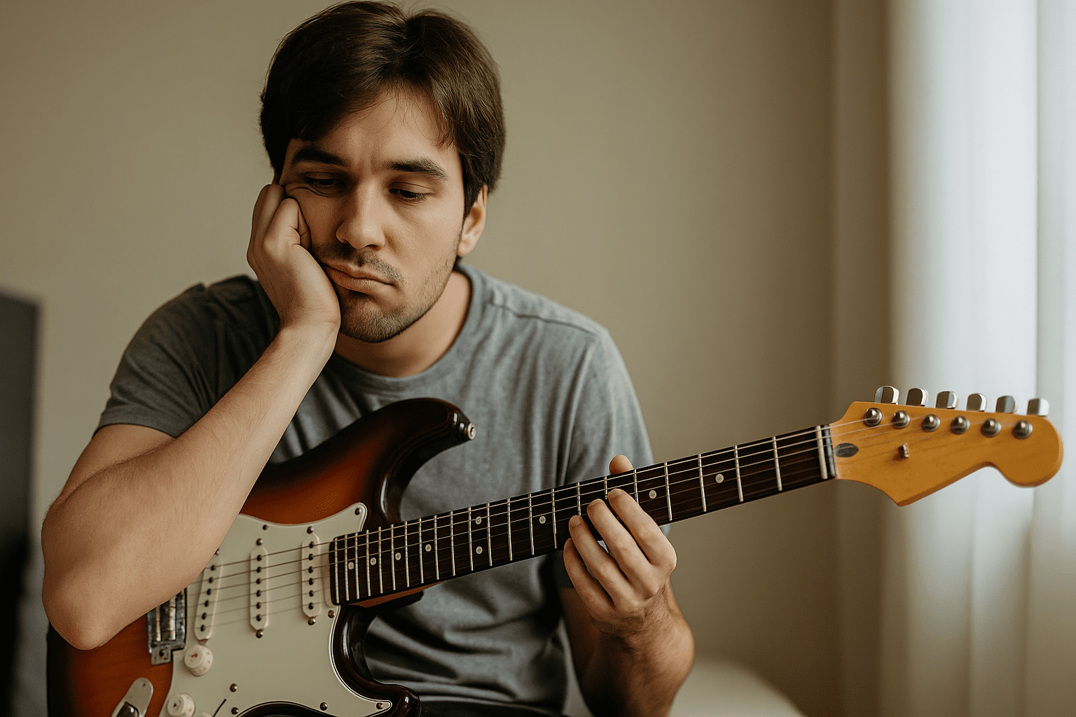 Fica inseguro porque ainda se perde no braço da guitarra quando toca em tons diferentes e não sabe mapear as escalas